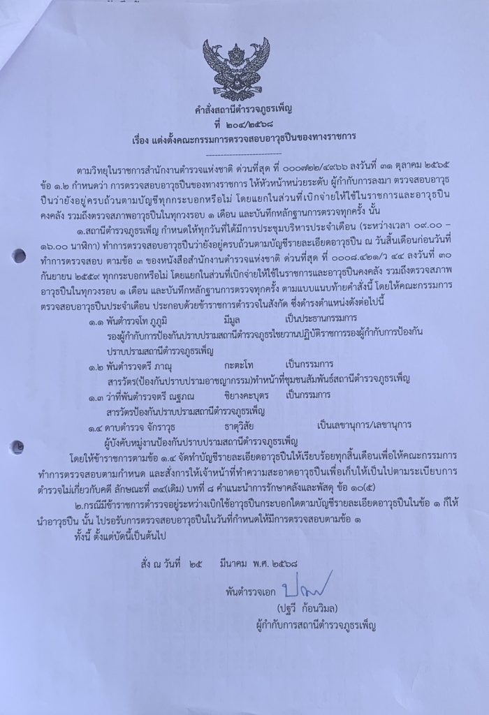 มอบหมายการดูแลสถานที่เก็บรักษาอาวุธปืนและเครื่องกระสุนปืนของทางราชการ