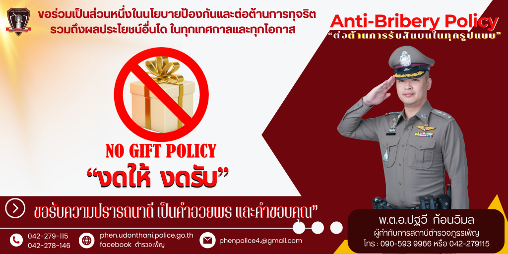 เมื่อวันที่ 14 มี.ค. 2568 เวลา 10.00 น. พ.ต.อ.ปฐวี  ก้อนวิมลผกก.สภ.เพ็ญ พร้อมด้วย พ.ต.ท.ภูภูมิ มีมูล รอง ผกก.ป.สภ.เพ็ญ, พ.ต.ต.ภาณุ กะตะโท สวป.(ชส.)สภ.เพ็ญ  ร่วมประกาศเจตนารมณ์และแสดงสัญลักษณ์ในการต่อต้านการทุจริตคอรัปชั่น โดยจะร่วมกันป้องกันและต่อต้านการทุจริตทุกรูปแบบ เช่น การไม่รับสินบน ของฝากที่มีลักษณะมีผลประโยชน์ร่วมกัน ฯ ตามนโยบายการขับเคลื่อนการประเมินคุณธรรรมและความโปร่งใสในการดำเนินงานของหน่วยงานภาครัฐ เพื่อให้เกิดการมีส่วนร่วม การป้องกันการทุจริต ในพื้นที่อย่างเป็นรูปธรรม โดยประชาสัมพันธ์ การป้องกันให้กับผู้นำชุมชน ชาวบ้านในพื้นที่  ณ ศาลากลางหมู่บ้าน หมู่ 9 ต.เพ็ญ อ.เพ็ญ จ.อุดรธานี