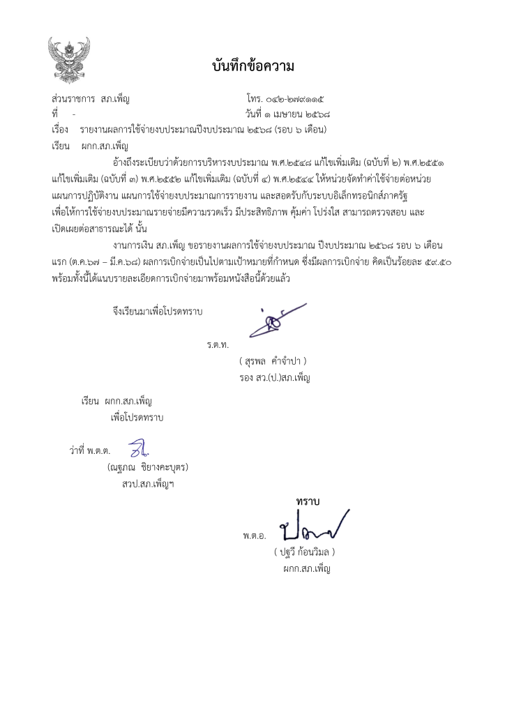 รายงานผลการใช้จ่ายงบประมาณ รอบ 6 เดือนแรก ของสถานีตำรวจภูธรเพ็ญ ประจำปีงบประมาณพ.ศ. 2568 ในรูปแบบ ไฟล์ PDF และ ไฟล์ Exel