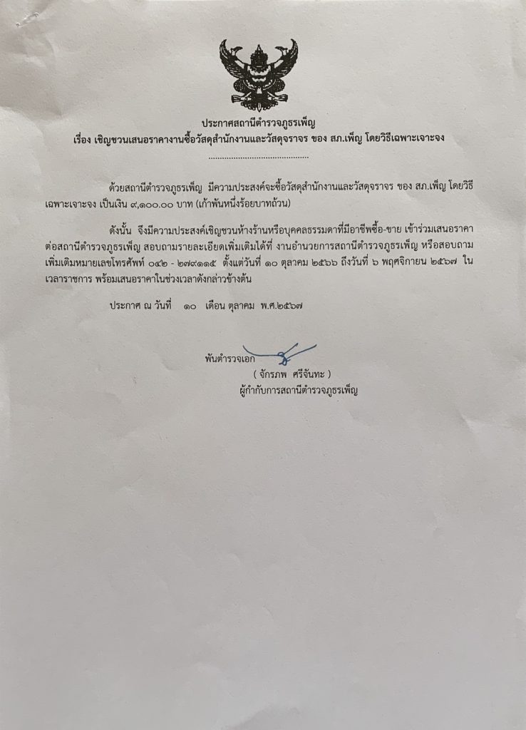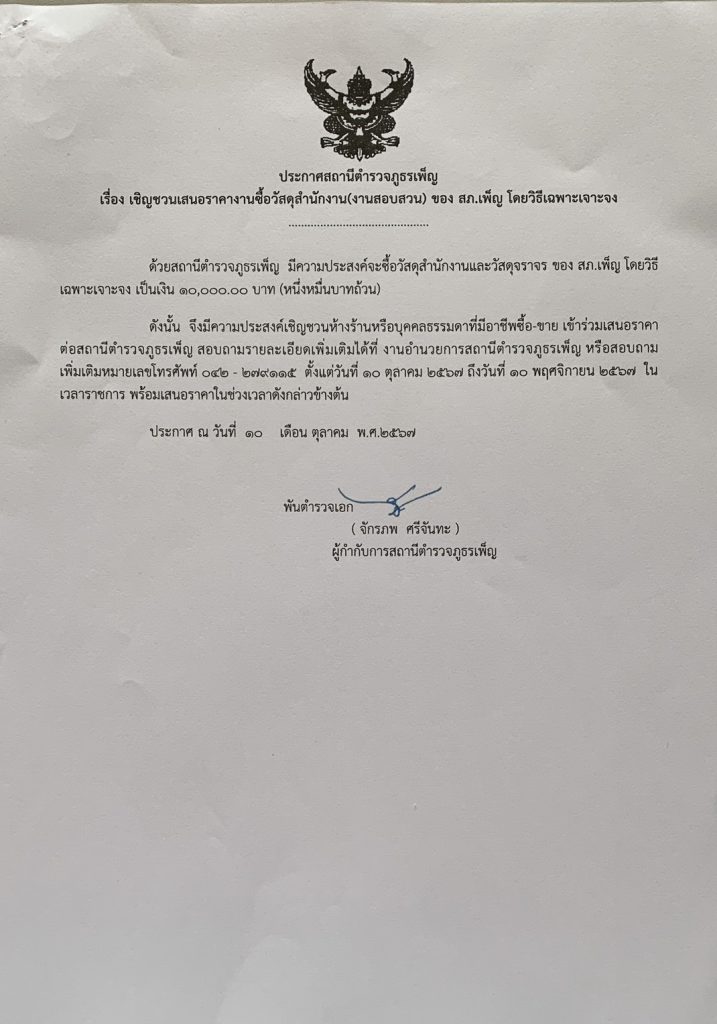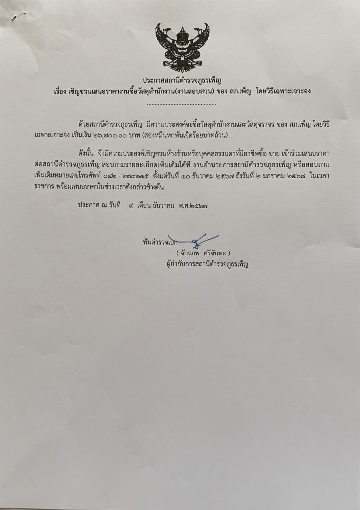 ประกาศเชิญชวนเสนอราคางานชื้อวัสดุสำนักงาน(งานสอบสวน)โดยวิธีเฉพาะเจอะจง