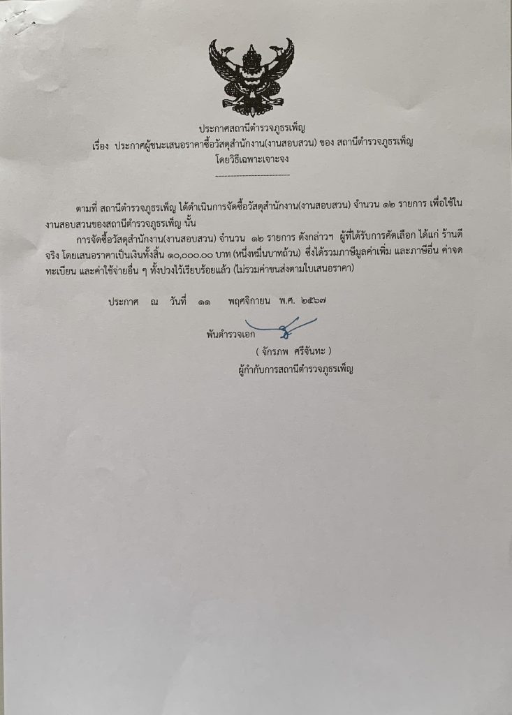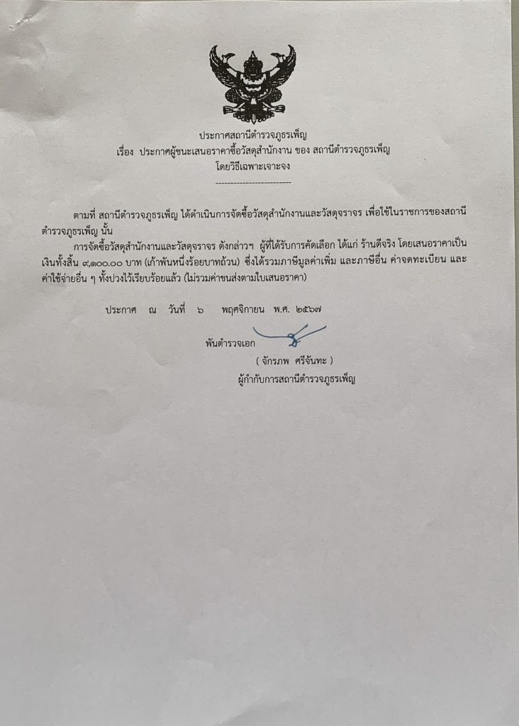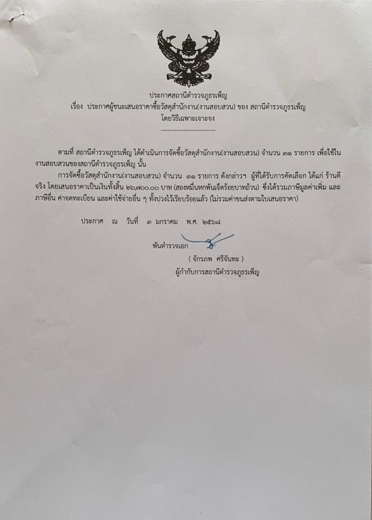 ประกาศผู้ชนะการเสนอราคางานชื้อวัสดุสำนักงาน(งานสอบสวน)โดยวิธีเฉพาะเจอะจง