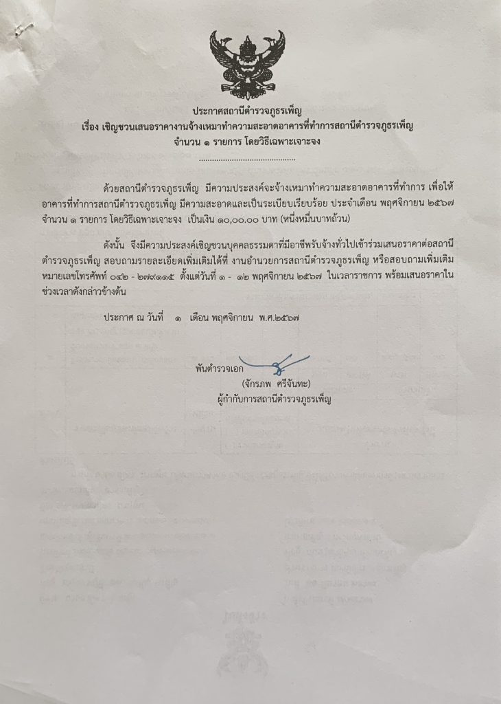 ประกาศเชิญชวนเสนอราคางานจ้างเหมาทำความสะอาดอาคารที่ทำการ โดยวิธีเฉพาะเจอะจง