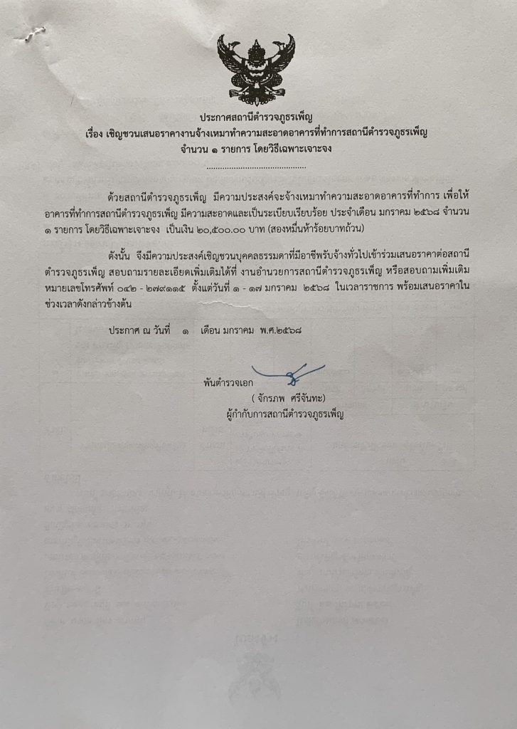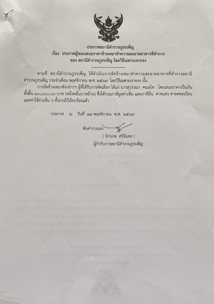ประกาศผู้ชนะการเสนอราคาจ้างเหมาทำความสะอาดอาคารที่ทำการโดยวิธีเฉพาะเจอะจง