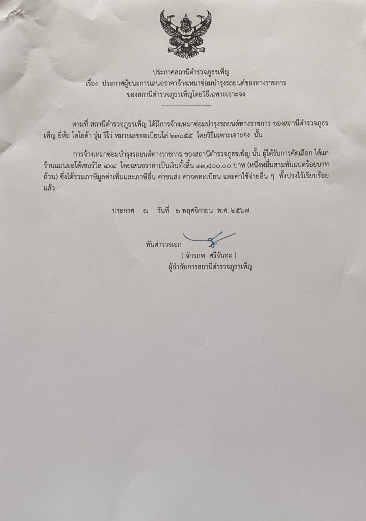 ประกาศผู้ชนะการเสนอราคาจ้างเหมาซ่อมบำรุงรถยนต์ของทางราชการ โดยวิธีเฉพาะเจอะจง