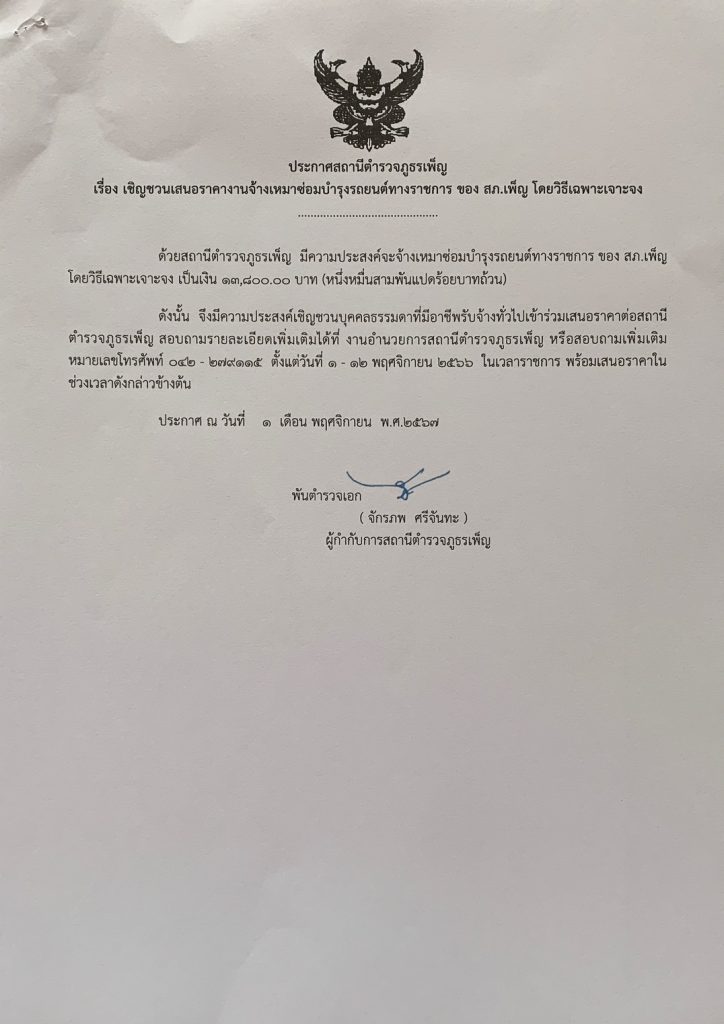 ประกาศเชิญชวนเสนอราคาจ้างเหมาซ่อมบำรุงรถยนต์ของทางราชการ โดยวิธีเฉพาะเจอะจง