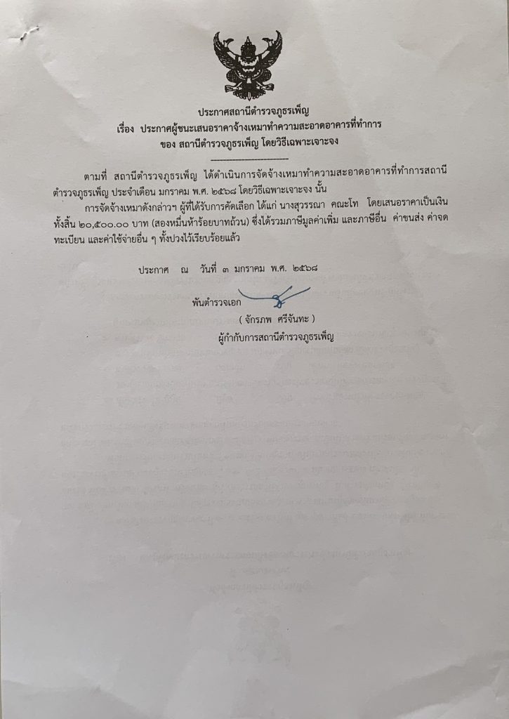ประกาศผู้ชนะการเสนอราคางานจ้างเหมาทำความสะอาดอาคารที่ทำการ โดยวิธีเฉพาะเจอะจง