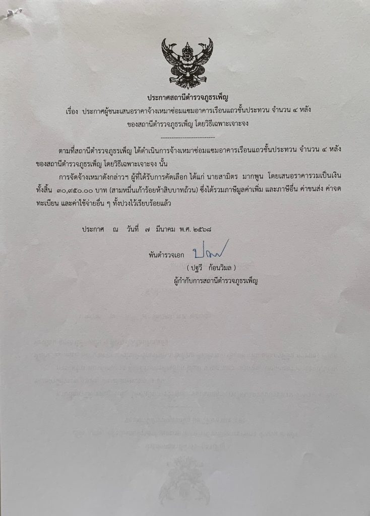 ประกาศผู้ชนะการเสนอราคาจ้างเหมาซ่อมแซมบ้านพักของทางราชการ โดยวิธีเฉพาะเจอะจง